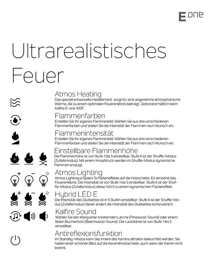 Die Kalfire E-One Eckkamine sind generell mit der Double Flame Technik ausgestattet. Hierbei werden die Flammen vor und hinter den Holzscheiten dargestellt. Optional kann man den E-one auch mit einer Heizung max. 2000W ausstatten lassen. Außerdem haben Sie die Wahl zwischen einem Flat (Standard)- und Design Feuerraumboden wählen (siehe Galerie).
